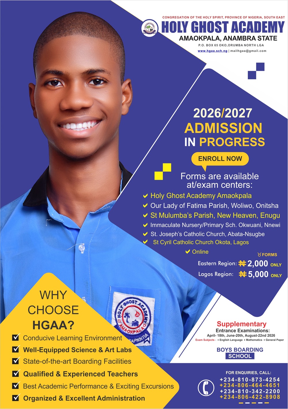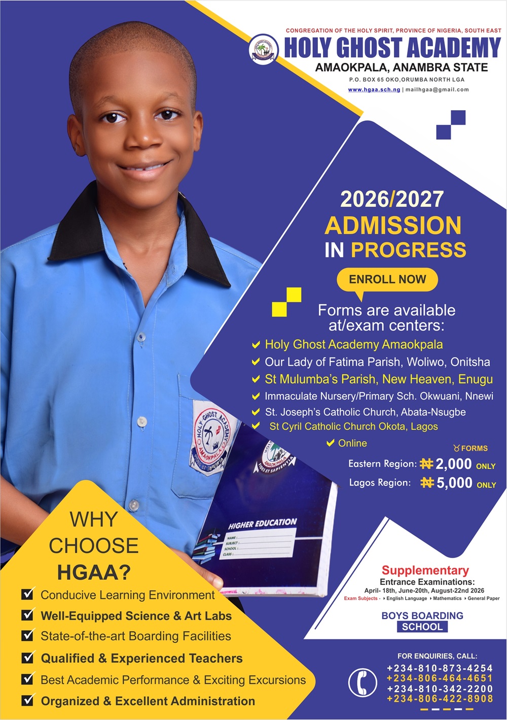 HOLY GHOST ACADEMY AMAOKPALA is a catholic mission school established on September 2003 by Congregation of the Holy Spirit, Province of Nigeria (South East), in order to promote sound Catholic Education and good Moral Values in Nigeria bearing in mind the cultural Values of the people.